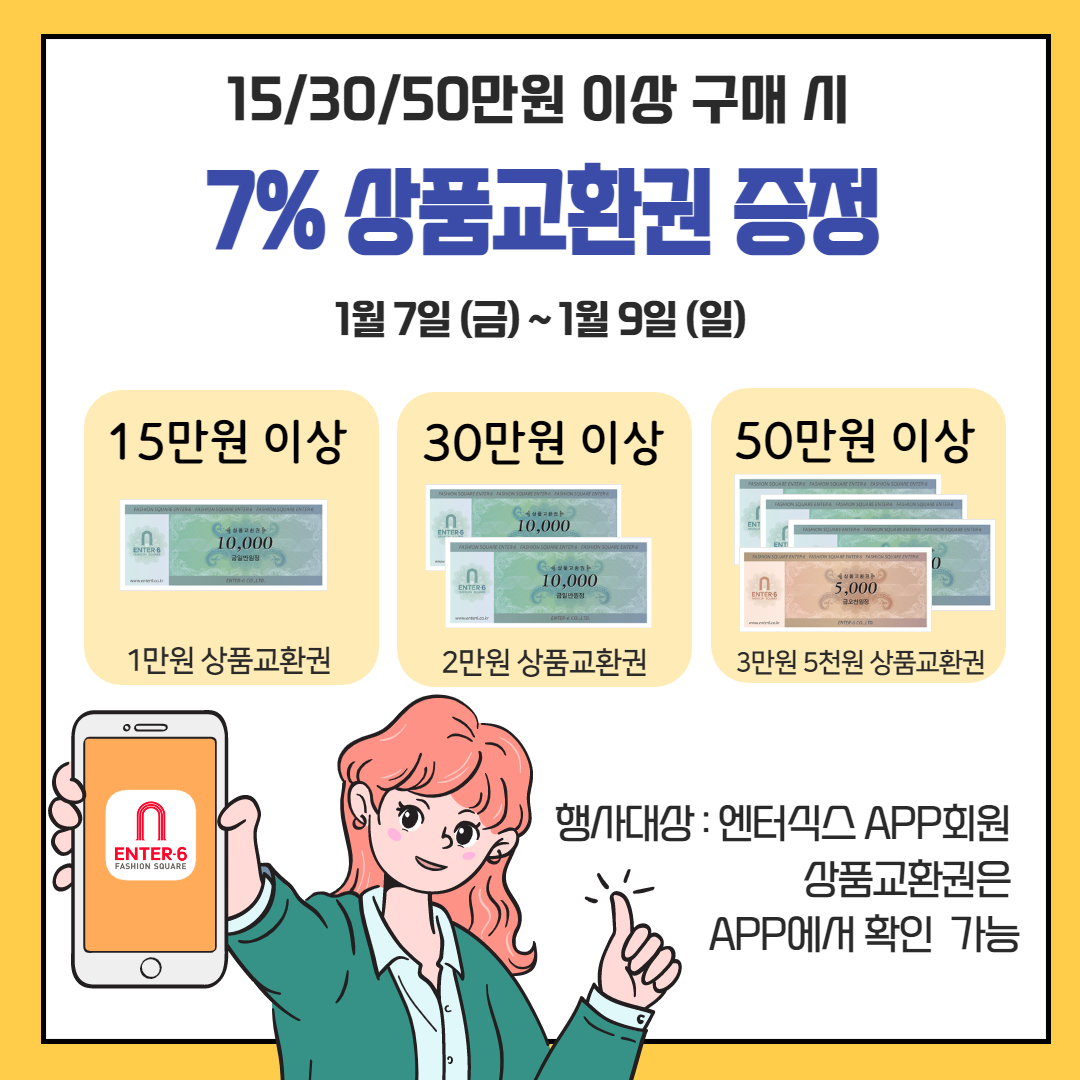 15, 30, 50만원 이상 구매 시 7% 상품교환권을 증정합니다.